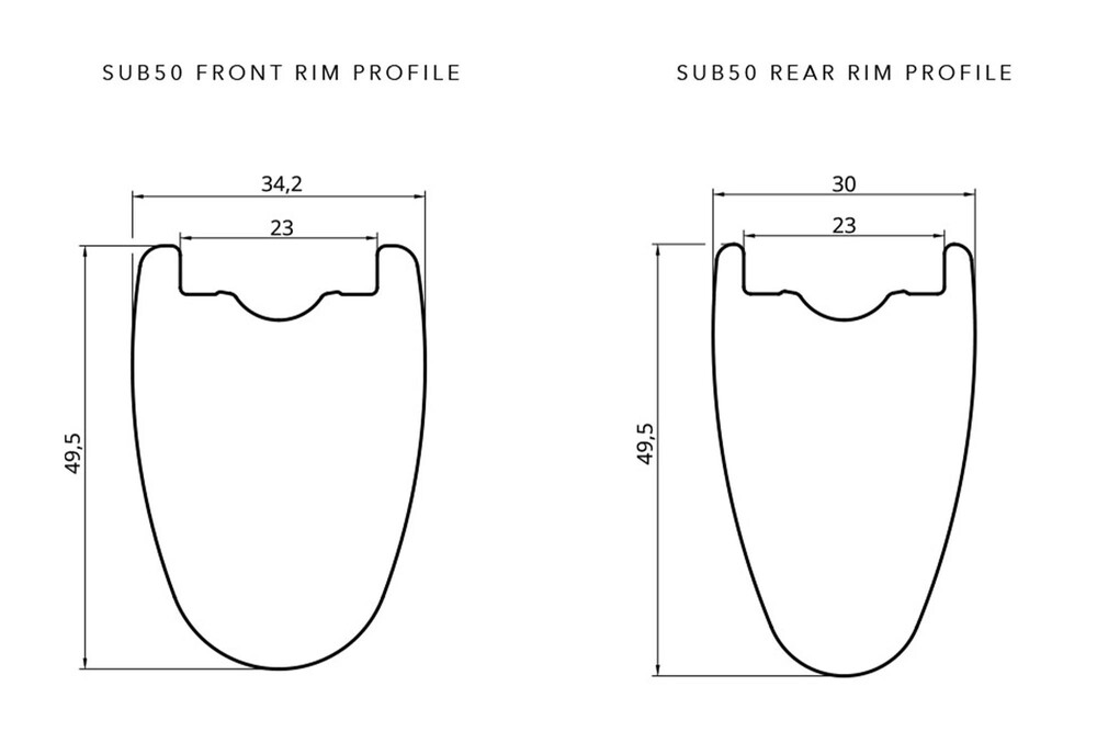 전륜가 후륜의 림형상을 달리하여 자전거 전방에서의 공기역학 효능을 최대화하면서 동시에 후방에서의 무게를 줄이고자 하였는데 현대 로드 레이싱에서 요구하는 극강의 구조적 내구성을 충족시키는 경량의 프로화일을 최신 카본 적층기술을 활용하여 실현할 수 있었다. 풍동실험을 통해서 Hunt SUB50 Limitless Wheelset이 공기역학적으로 다른 경쟁사의 30mm 타이어를 장착한 50mm이하 휠셋을 능가하여 바로 뒤를 이은 경쟁사 휠셋보다 1.8 watt를 줄일 수 있었다. 또한 무게 대비 공기역학 효율성(aero efficiency-to-weight)과 높이대비 공기역학 효율성(aero efficiency-to-depth)에서도 경쟁 휠셋들을 능가하였다. Limitless Width Aero Technology를 적용하여 SUB50 Wheelset은 넓은 측면 yaw angles에서도 부드러운 스티어링 성능을 보여 안정성있는 예측가능한 라이딩이 가능하게 해주어 정말 범용성이 넓은 보다 빠르면서도 무게는 더 가벼운 all-around aero wheelset으로 탄생하였다.