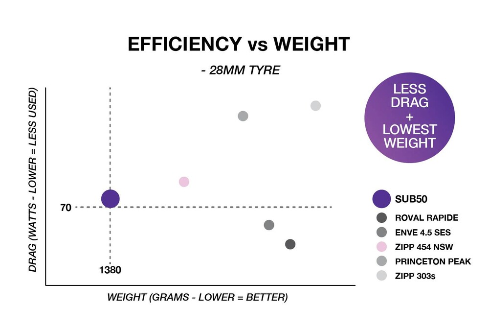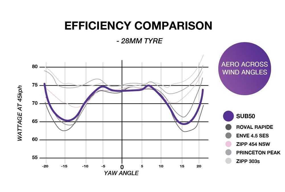 SUB50 Limitless Aero Disc Wheelset은 50mm이하의 모든 휠중에서 전반적으로 가장 뛰어난 성능을 보였으며 가장 근접한 성능을 보인 경쟁 휠셋인 DT Swiss ARC 1400 DICUT 50 DB (1,456g)의 경우 3mm 더 좁은 내부림폭으로 보다 가는 타이어 형상을 가져 28mm 타이어 장착하여 진행된 풍동실험에서 공기역학 성능이 다소 뛰어났다 (Run A: 0.6 W faster, Run B: 0.14 W slower). 30mm 타이어 장착 풍동실험에서는 SUB50이 1.85 watt DT Swiss 50보다 우위를 보였으며 보다 넓은 내부림폭으로 인한 보다 낮은 구름저항과 향상된 그립감과 승차감을 보였다. SUB50 Limitless Aero Disc Wheelset이 Zipp 454 NSW (55/58mm, 1428g)과 비교 테스트한 결과 30mm 타이어 경우 3.07 watts, 28mm 타이어 경우 0.99 watts 공기역학 성능 우위를 보였다. 스틸 스포크 모델의 1,428 gram이고 UD 카본 스포크 모델의 1,380 gram 무게를 가진 SUB50 Limitless Wheelset에 30mm 타이어를 장착한 경우 28mm 타이어를 장착한 HUNT 48 Limitless Wheelset보다 1.40 watt 절감된 결과를 보여 타이어 폭을 증가하면서도 aero drag를 줄이는데 성공한 것을 확인할 수 있었다. 미드 림 영역에서 HUNT SUB50 Limitless Wheelset이 30mm 타이어를 장착한 50mm 이하의 경쟁 휠셋보다 공기역학적으로 우위를 보였으며 보다 하이림의 경쟁사 휠셋과는 유사한 성능을 보여주었다. 무게 대비 공기역학(aero to weight) 그리고 높이 대비 공기역학(aero to depth)을 감안한다면 HUNT SUB50 Limitless Wheelst이 경쟁사 휠셋 대비 상당한 우위를 보여주었다.