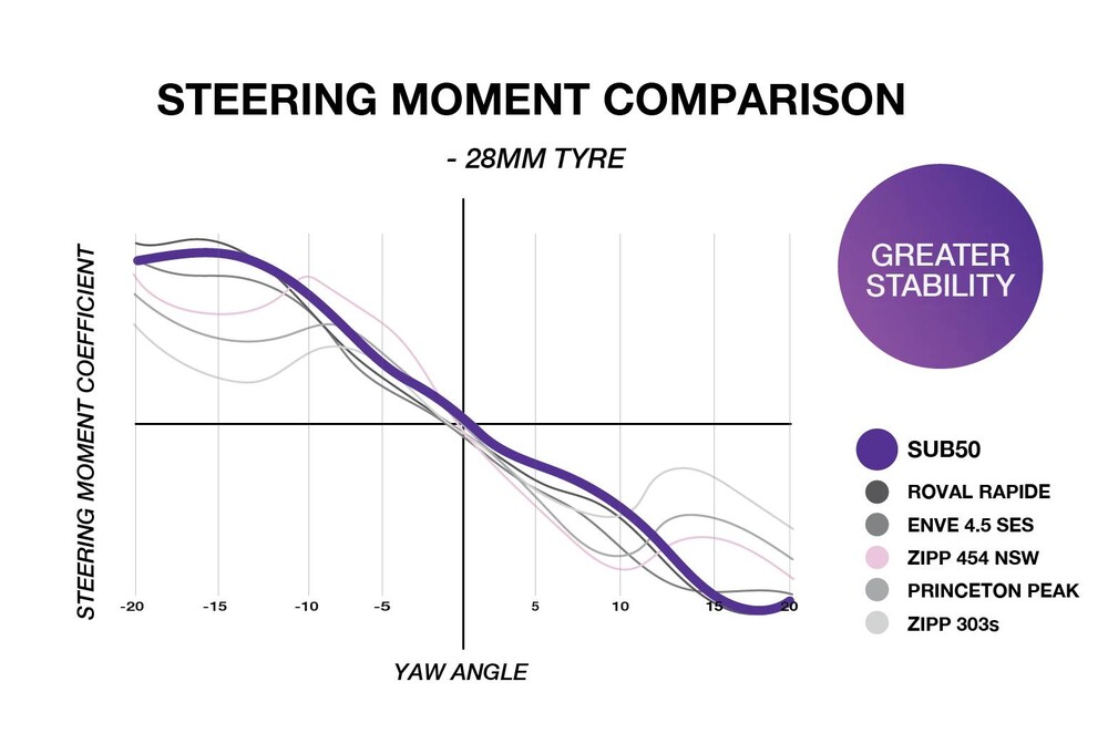 HUNT 48 Limitless Wheelset에 대한 프로 라이더들의 피드백은 초광폭 프로화일이 훨씬 높은 림을 가진 휠셋처럼 스피드를 유지하고 바람을 잘 가를 뿐 아니라 훨씬 좁은 림폭을 가진 휠셋처럼 바람 변하는 환경속에서 안정성과 예측가능성을 제공한다는 것이였다. 이 점은 혼잡한 구간이나 폭발적인 스프린트 환경에서 특히 매우 중요하다. SUB50 Limitless Speed Project에서 이러한 장점들을 확보하는 것은 분명한 목표가 되었는데 변화하는 바람 속에서의 예측가능성은 라이더들이 낮은 에어로 포시션에서 보다 오래동안 편안하게 유지할 수 있게 해주기 때문이다. 이는 장거리 로드 레이싱에서 효율성과 소비 에너지에 중대한 영향을 미친다. 또한 아래 steering moment co-efficient graph에서 보여주듯이 림 스포크 베드의 넓은 반경으로 얻어지는 안정성으로 더 일관되고 조정가능한 스티어링을 보여준다. Steering moment co-efficient는 림에 가해지는 측면 압력에 비례한다.