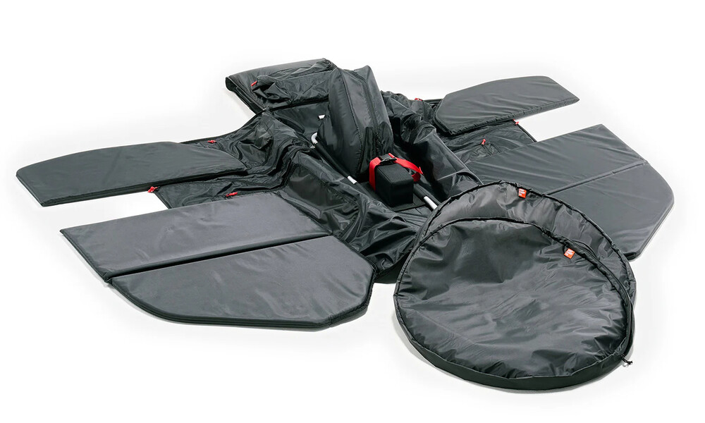 - Integrated Cockpit Bikes Pack With Ease: 자전거 포장에 몇 분이면 충분하다. 휠셋, 시트포스트, 리어 드레일러를 탈거하고 나머지는 그대로 두면된다. 핸들바, 스템, 케이블이나 호스 분리는 할 필요가 없다. 휠은 각각 별도의 패드처리된 휠백에 수납하며 55mm 타이어까지 장착된 상태로 수납된다.