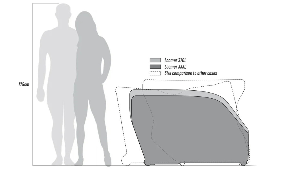 - Folds Flat For Storage: The Loomer’s polycarbonate reinforcement panels slide out from the sides, allowing them to fit neatly inside the case for storage. From its full height of 76 cm or 82 cm (333 L and 370 L sizes, respectively), the Loomer folds down to just 30 cm tall.