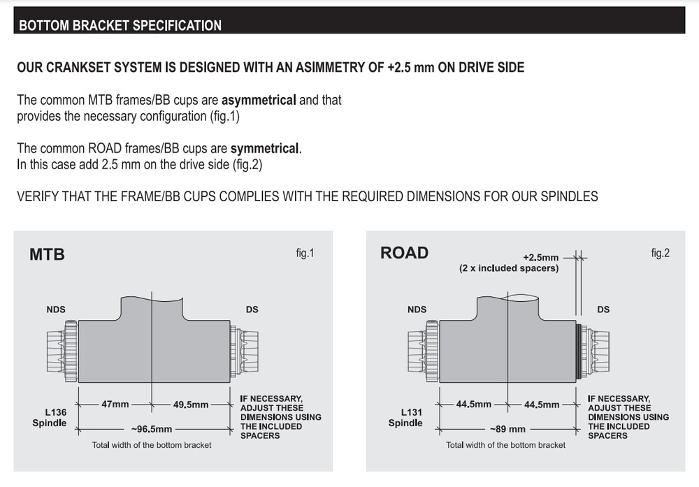 - Q-Factor: 163mm (L131) / 168mm (L136) / 173 mm (with L141 spindle) (The length of BB including spacers)
