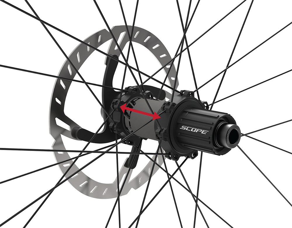 Scope는 항상 독차적인 허브들을 개발하여왔는데 그 이유는 휠은 단순한 부품의 조립이 아닌 시스템적으로 개발되고 제조되어야 한다고 생각했기 때문이다. 하나의 시스템으로 휠을 제조함으로써 허브의 기하학적 설계는 최적의 스포크 텐션으로 최적의 측면 강성을 확보하는데 최적화될 수 있다. 뒤 허브의 61mm라는 보다 넓은 폭의 테두리 거리는 51 N/mm의 측면 강성을 실현할 수 있게 했다. 또한 리어 휠의 2:1 스포크 패턴은 림과의 3 mm off-set으로 Non-Drive Side 스포크 강성과 Drive Side의 스포크 강성을 거의 동일하게 할 수 있어 보다 강한 측면 강성과 내구성을 확보할 수 있게 하였다.
