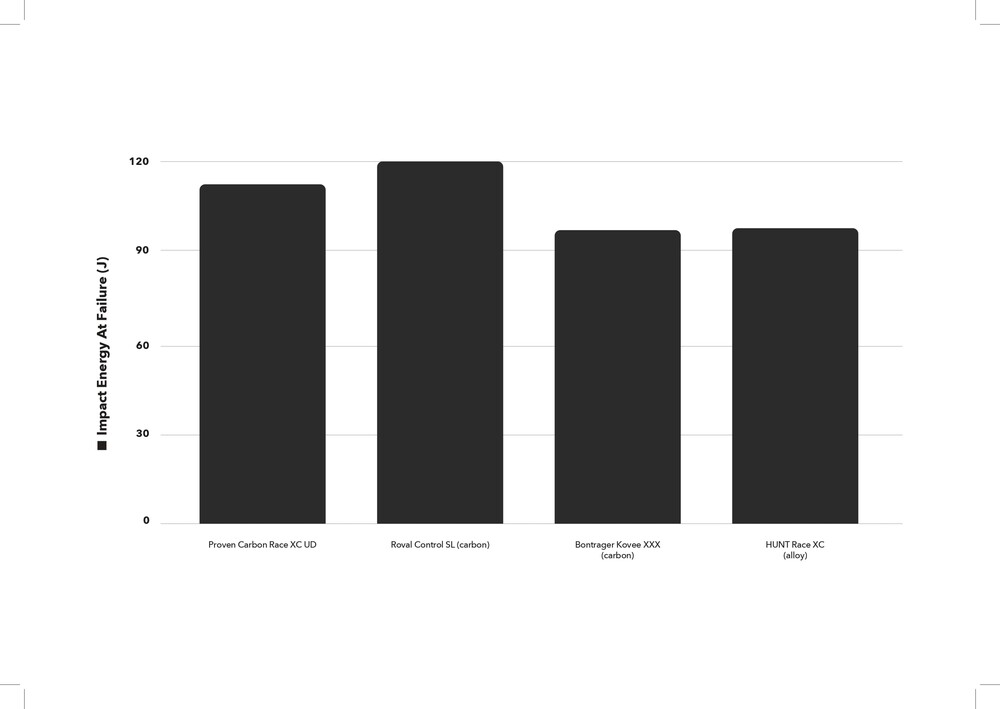 Hunt의 인하우스 테스트는 매우 진지하게 진행되며 having 새로운 엔지니어링 시설과 맞춤 제잗된 충격 테스트 리그(rig)로 모든 신규 Hunt 휠셋은 높은 수준의 테스트 기준을 충족한다는 것을 100% 확신할 수 있다. 아래 그래프는 Hunt Proven Carbon Race XC와 선도적인 경쟁휠셋들의 테스트 결과로 첫번째 실패시 기족된 충격 에너지를 보여준다.