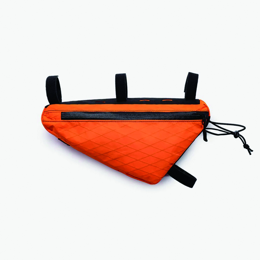 Slice weather proof frame bag은 맴시있는 유선형 디자인으로 라이딩시 무릎의 간섭없이 최대한의 보관용량을 가진다. 로드 자전거와 그래블 자전거의 전방 프레임의 삼각형에 완벽하게 장착될 수 있는 디자인으로 2개의 물통을 장착한 상태에서도 부착이 가능하다.