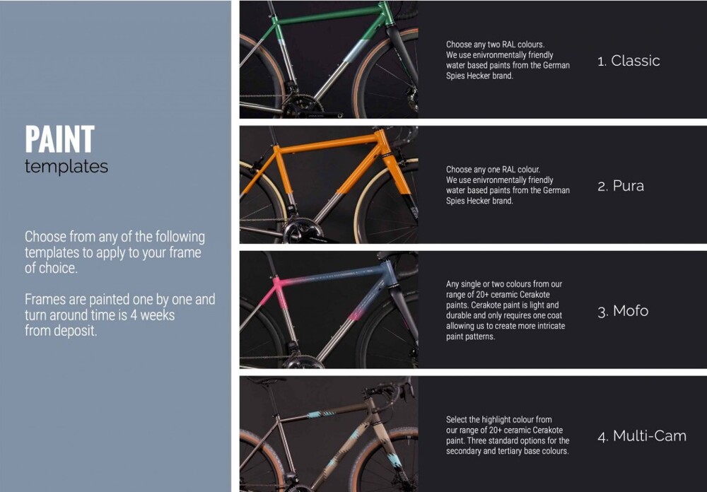 아래 4가지 템플렛중에서 당신의 프레임에 적용할 것을 아무 것이나 선택하세요. 각 모델별도 기본 템플렛이 있으며 A21의 경우 multi-cam이 기본 템플렛이며 다른 템플렛을 선택하는 경우 추가 비용이 다소 발생합니다. 프레임은 한번에 하나씩 페인팅되며 선금을 낸 후 4주 정도 소요됩니다.